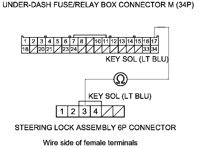 11. Check for continuity between under-dash fuse/relay box connector M (34P) terminal No. 17 and steering lock 6P connector terminal No. 3.