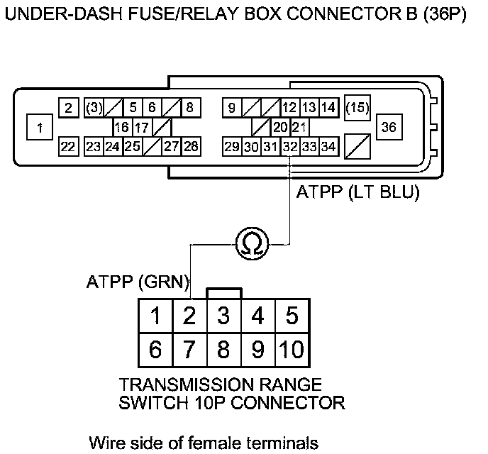 21. Check for continuity between under-dash fuse/relay box connector B (36P) terminal No. 32 and transmission range switch 10P connector terminal No. 2.