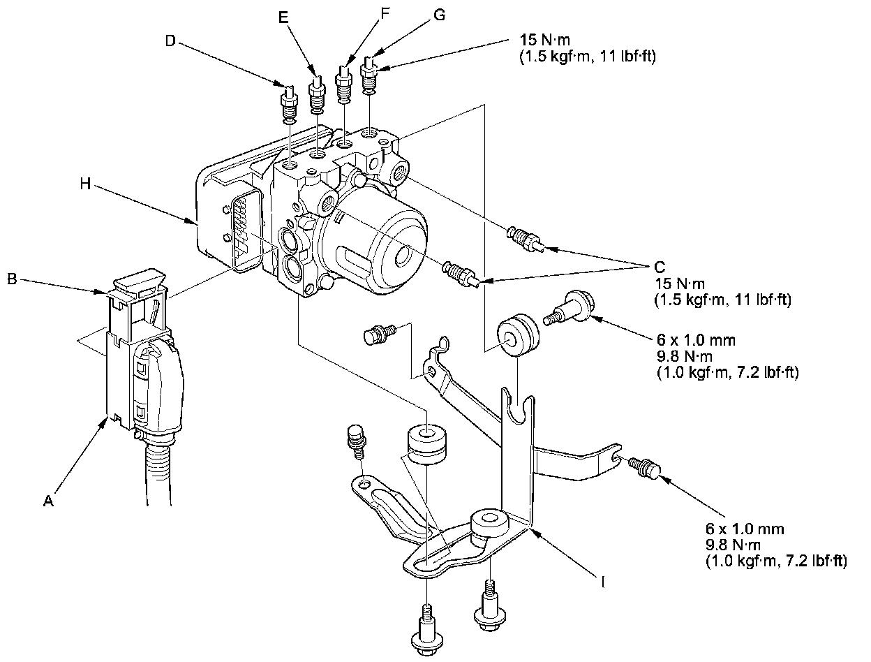 5. Remove the ABS modulator-control unit (H) with the bracket (I) from the body.