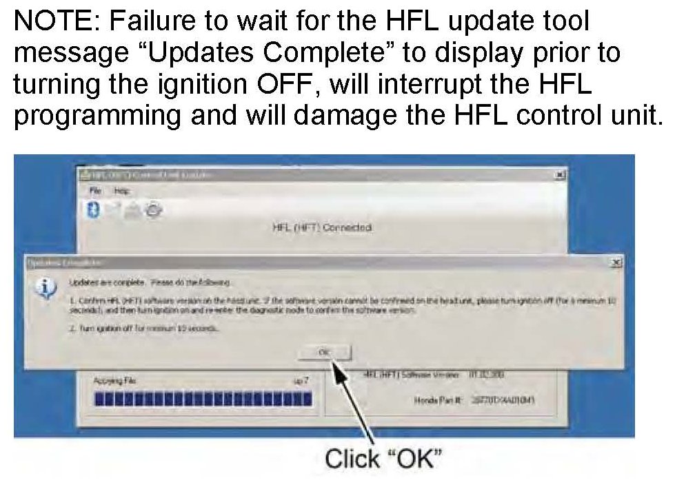 ^ If you see: "01.XX.XXX_(TO)_01.XX.XXX update," the PartNumberFix update is complete. You must now update the HFL control unit software. Go to HFL CONTROL UNIT UPDATE PROCEDURE - CR-V, Vehicles without Navigation.