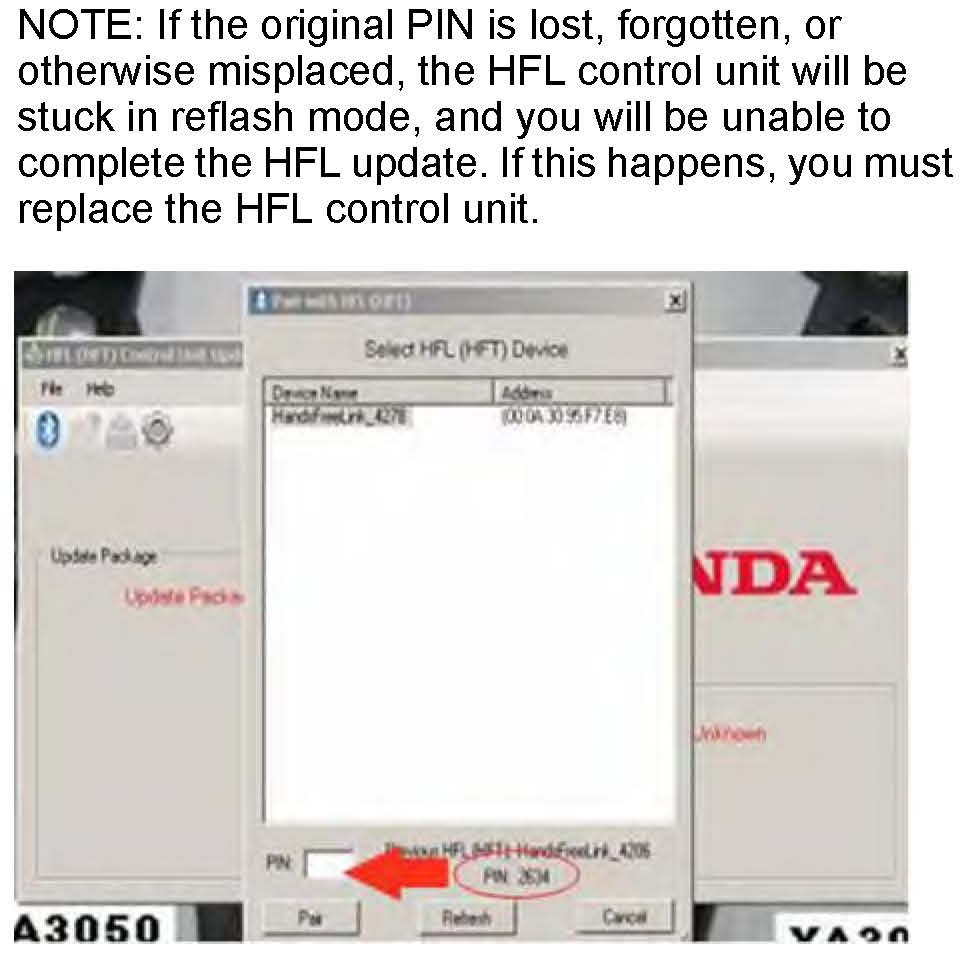 17. In the HFL update tool, enter the original 4-digit PIN you wrote down in HFL CONTROL UNIT UPDATE PROCEDURE, Vehicles without Navigation, step 7, into the lower left corner of the popup window. Click Pair to start the pairing process.