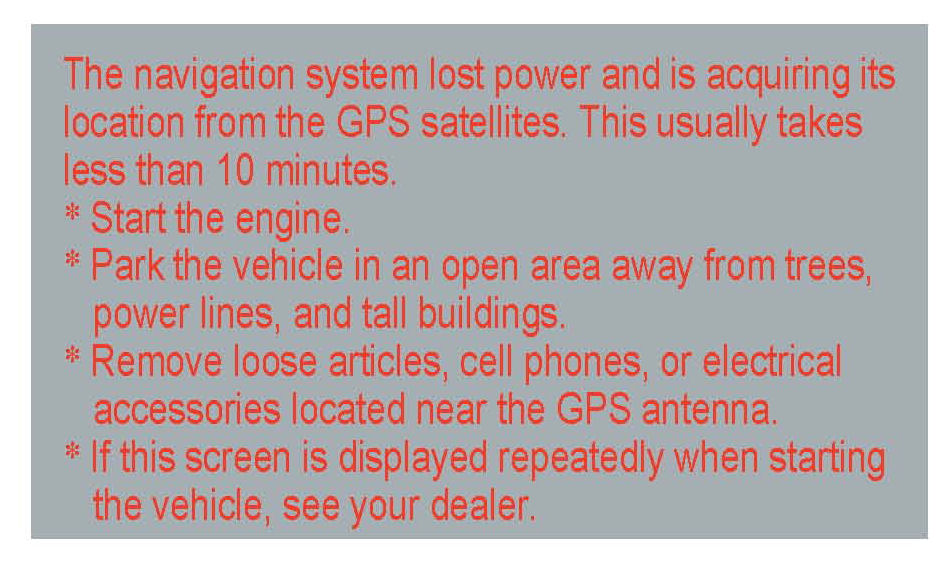 4. The instructions below appear on the screen to indicate that the system is initializing (determining its location from the GPS satellites). Follow the on-screen instructions.