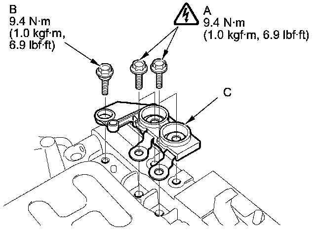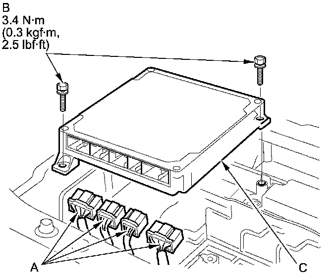 6. Remove the bolts (B) and the MCM (C).