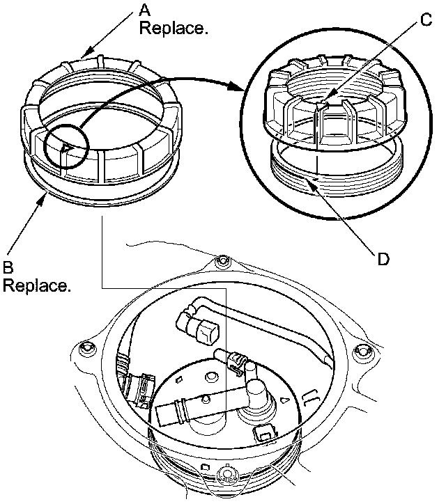 7. Remove the locknut (A), the fuel tank unit (B), and the locknut plate (C).