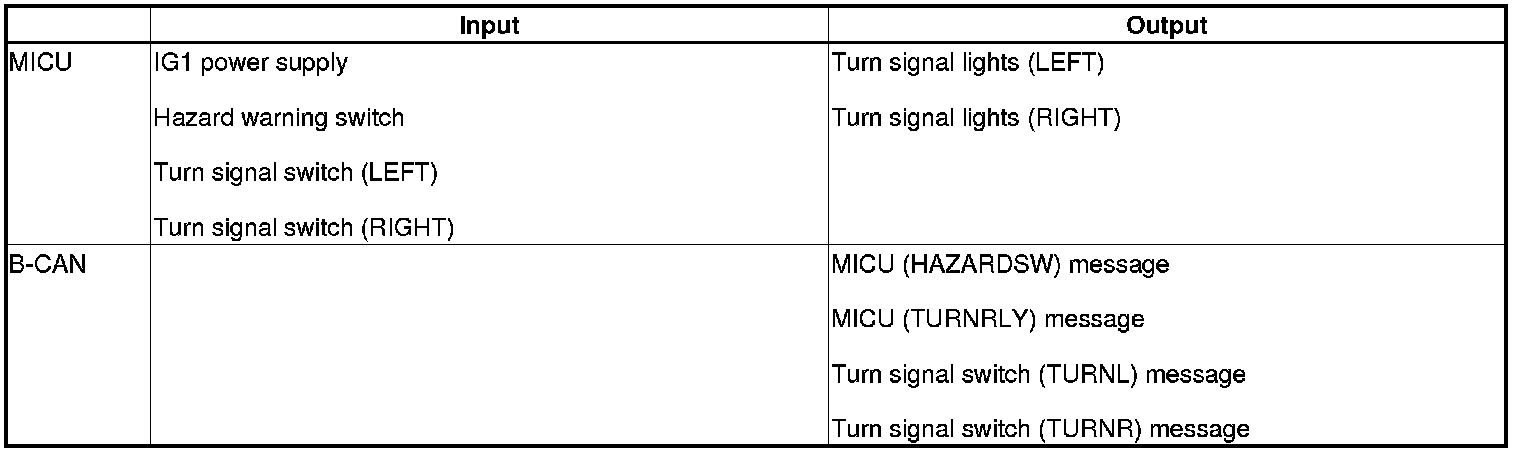 The MICU control of the turn signal/hazard warning lights is based on inputs signals from the turn signal switch and the hazard warning switch.