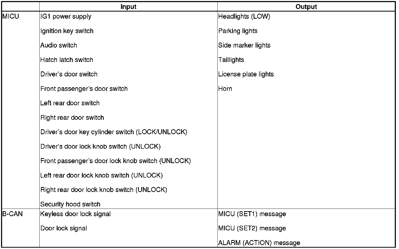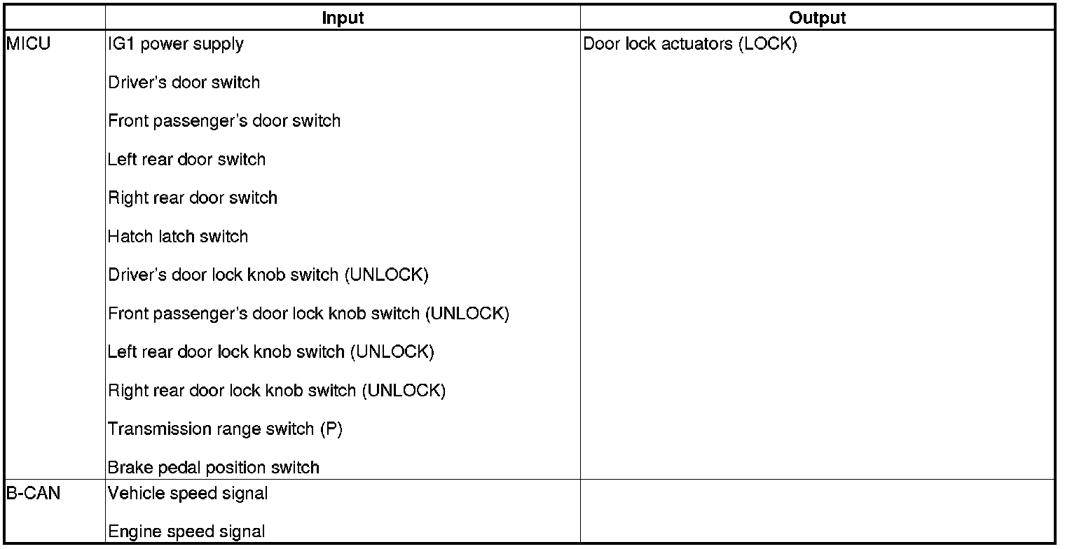 The MICU control of the door lock actuators is based on inputs from each switch and B-CAN data.