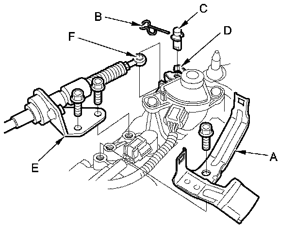 12. Apply molybdenum grease to the hole in the shift cable end collar (A). Attach the shift cable end to the selector control lever (B). Insert the control pin (C) through the selector control lever hole (D), through the shift cable end hole, and into the selector control lever slotted hole (E) in the direction shown. Push the control pin until its flange (F) contacts the selector control lever surface.