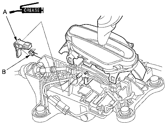 3. Remove the shift lock release (A) and release spring (B), and replace the shift lock release or the release spring.