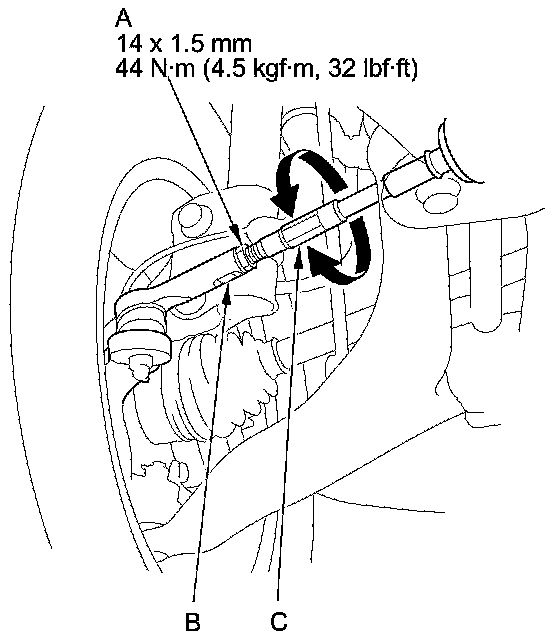 3. Loosen the tie-rod locknuts (A) while holding the flat surface sections (B) of the tie-rod end with a wrench, and turn both tie-rods (C) until the front toe is within specifications.