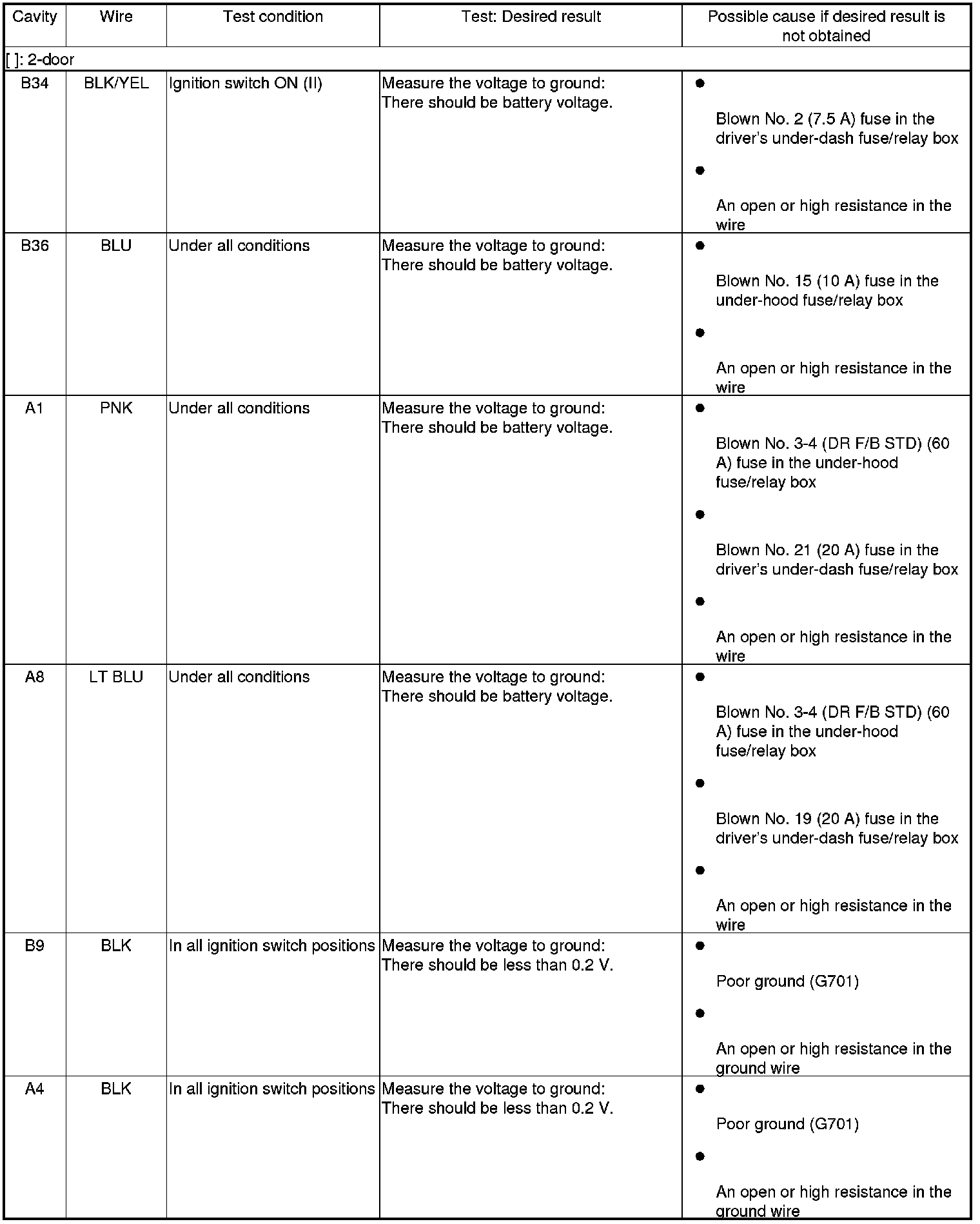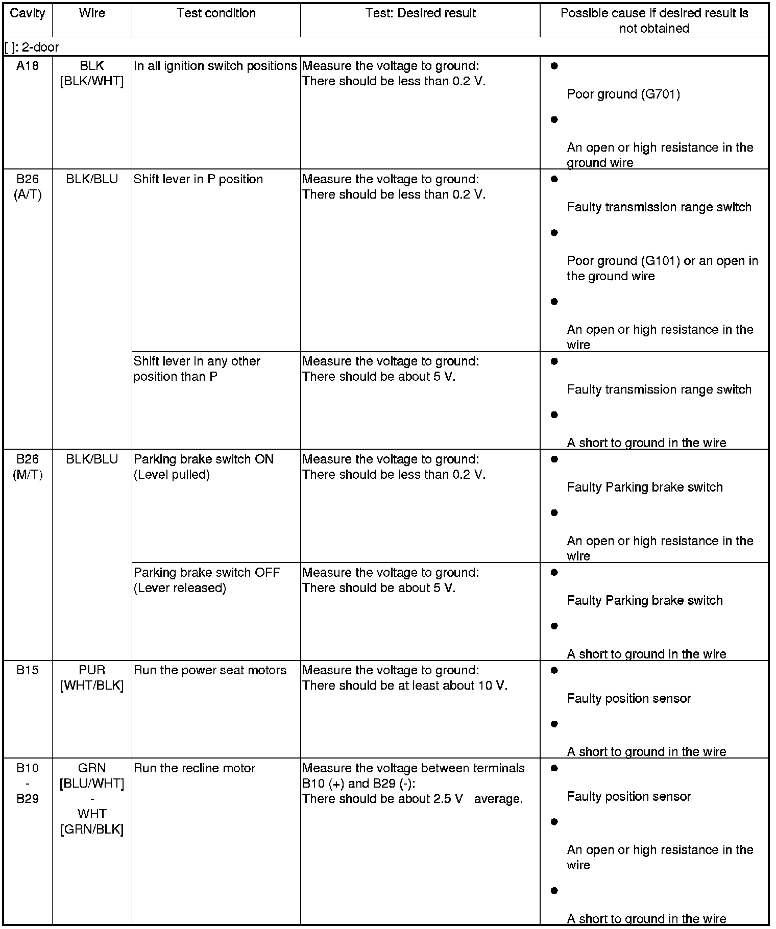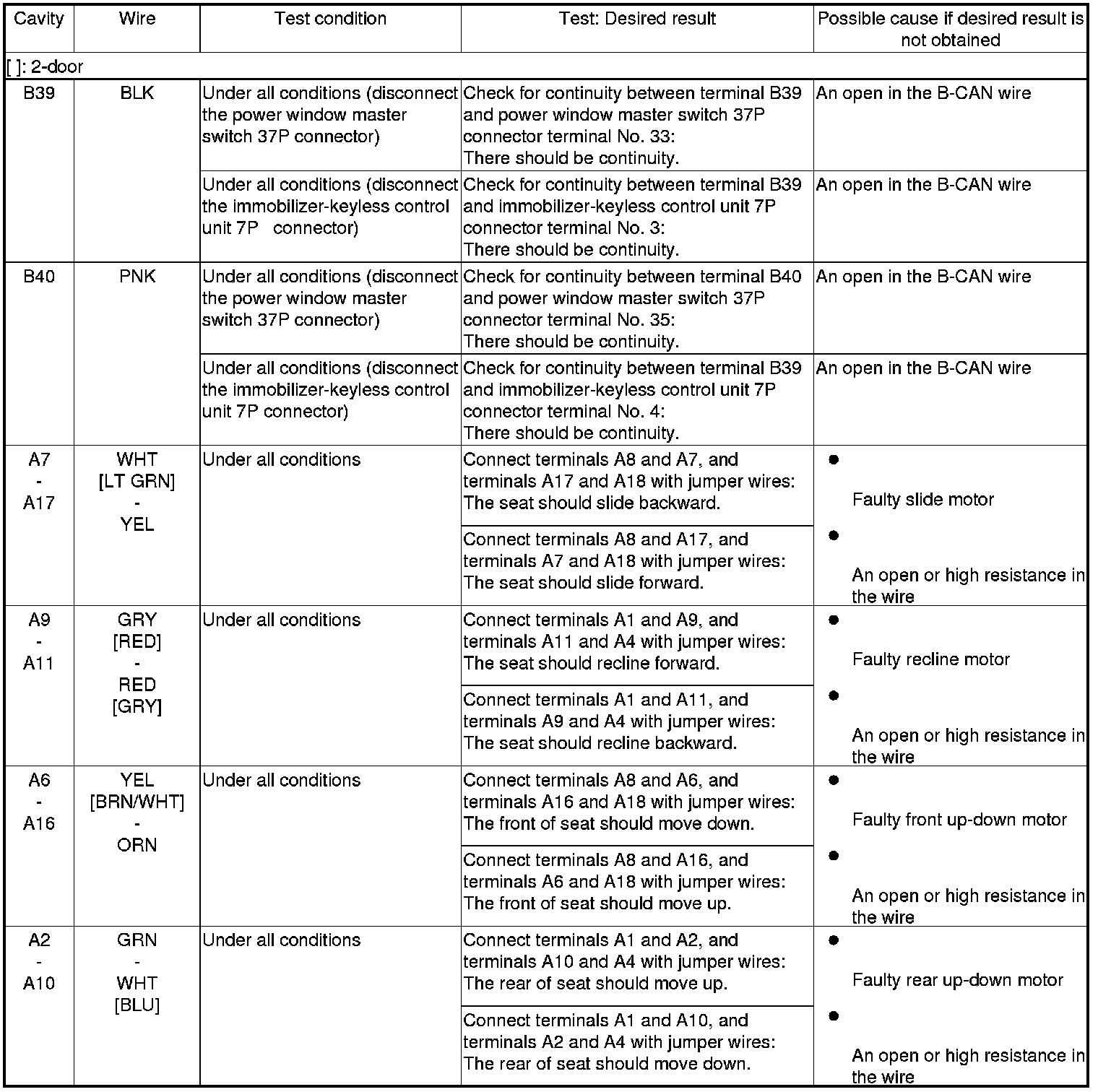 7. Disconnect the connectors from the power seat control unit, and do the following input tests: