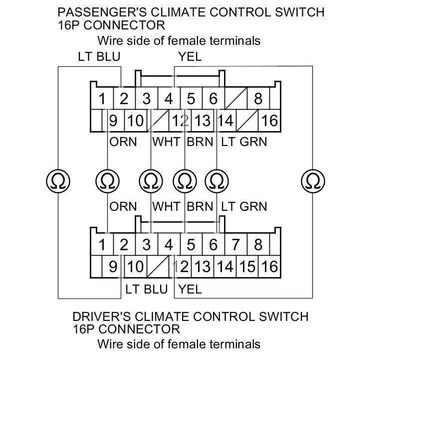9. Check for continuity between the following terminals of the passenger's climate control switch 16P connector and the driver's climate control switch 16P connector.