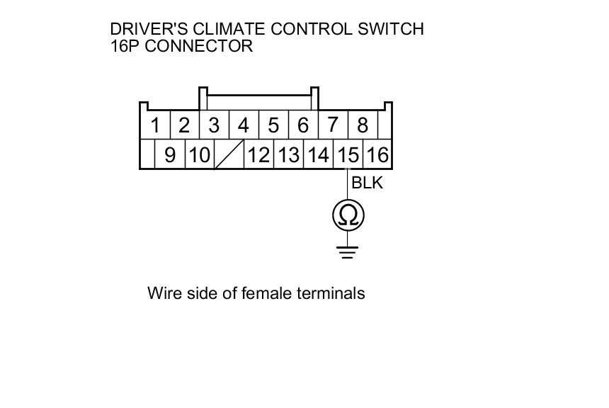 16. Check for continuity between driver's climate control switch 16P connector terminal No. 15 and body ground.