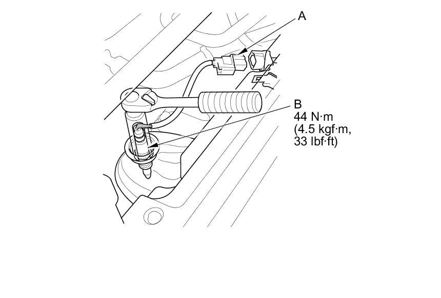 1. Disconnect the A/F sensor 4P connector (A), then remove the A/F sensor (B).