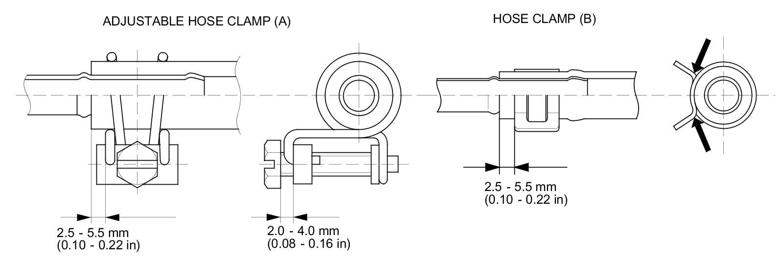 - Connect each hose to the corresponding line securely until it contacts the stop on the line. Install the clamp or adjustable clamp at the specified distance from the hose end as shown.