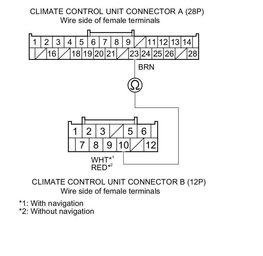 11. Measure the evaporator temperature sensor resistance between climate control unit connector A (28P) terminal No. 23 and connector B (12P) terminal No. 10.