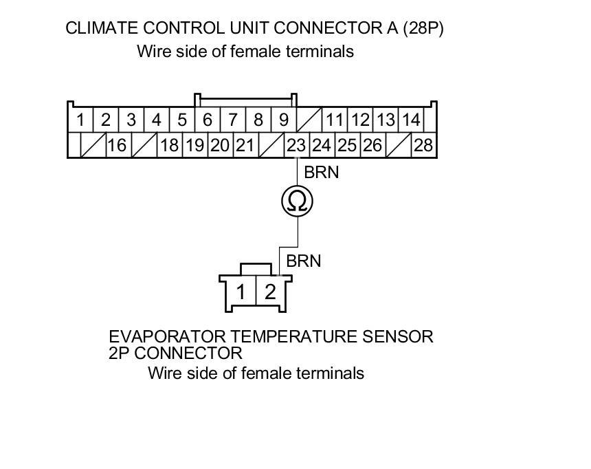 13. Check for continuity between climate control unit connector A (28P) terminal No. 23 and evaporator temperature sensor 2P connector terminal No. 2.