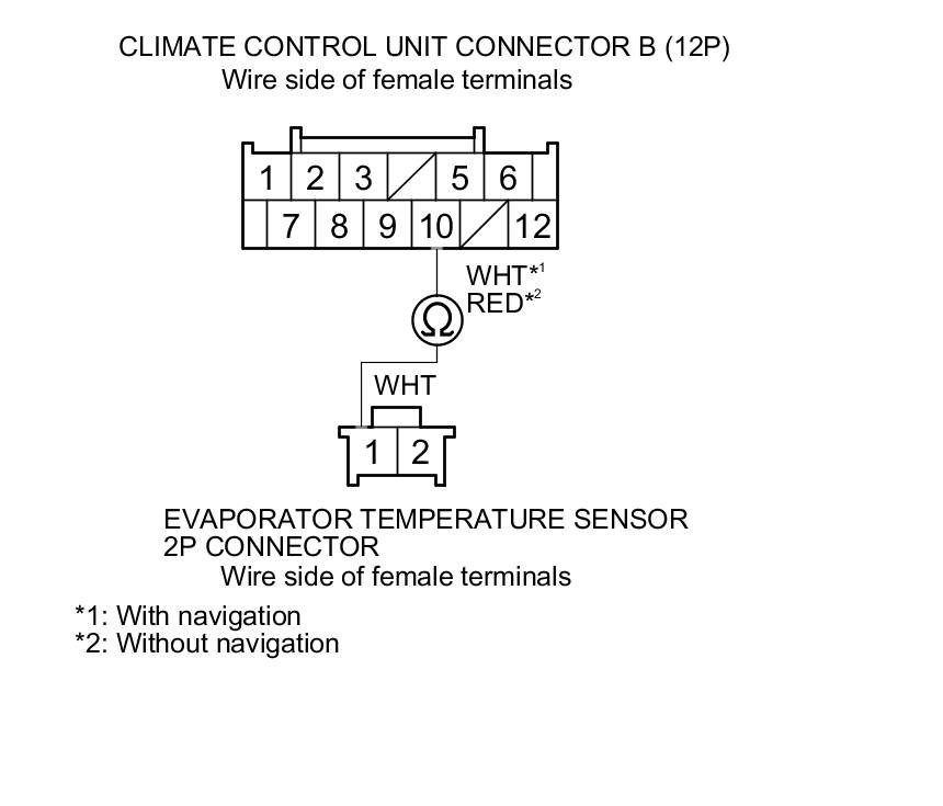 14. Check for continuity between climate control unit connector B (12P) terminal No. 10 and evaporator temperature sensor 2P connector terminal No. 1.