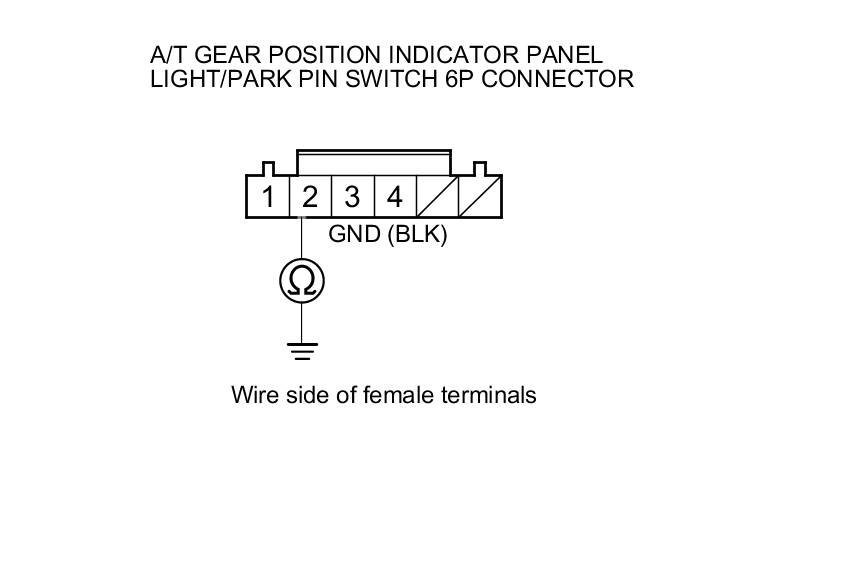 17. Check for continuity between A/T gear position indicator panel light/park pin switch 6P connector terminal No. 1 and body ground.