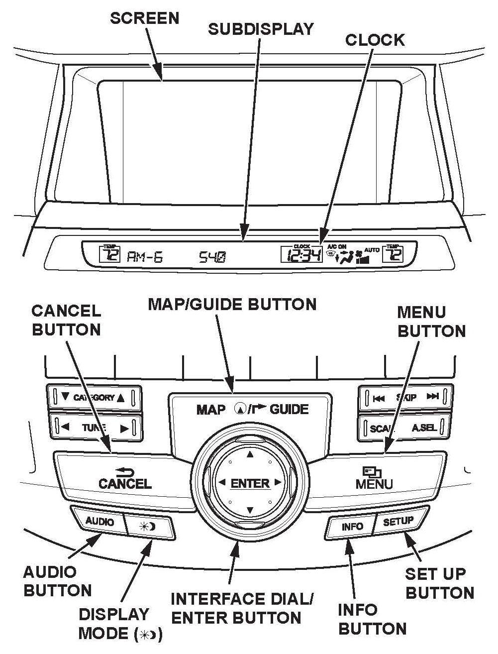 The buttons listed above are used in this service bulletin. For more information on the button functions, see Getting Started in the navigation manual.
