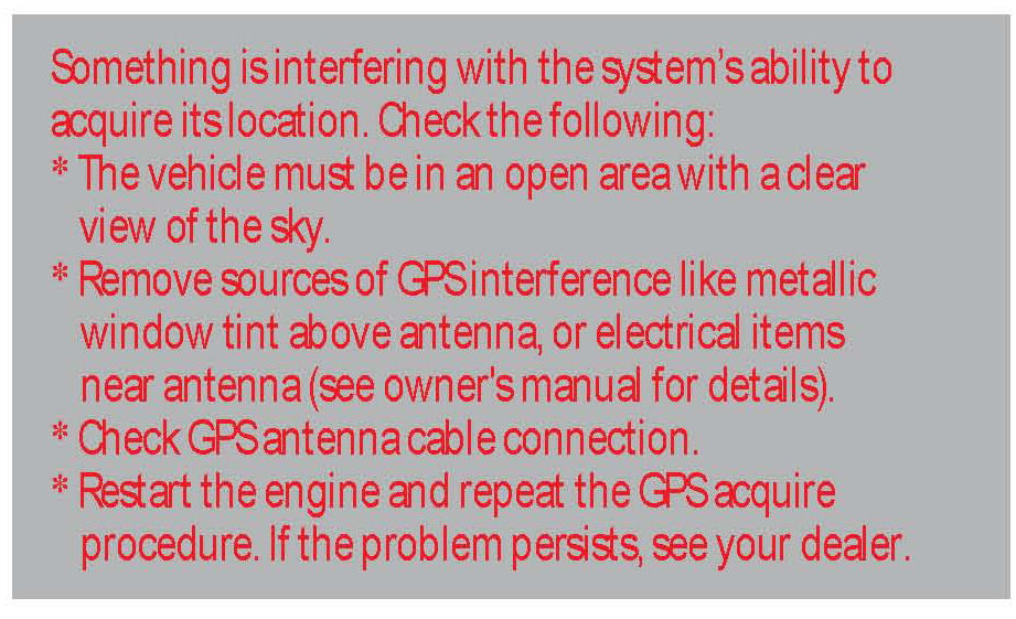 ^ The GPS antenna receives location information from orbiting satellites. Anything that blocks or interferes with the signal affects accuracy. The GPS signal can be blocked or interfered with (vehicle position shown incorrectly on the map) by: