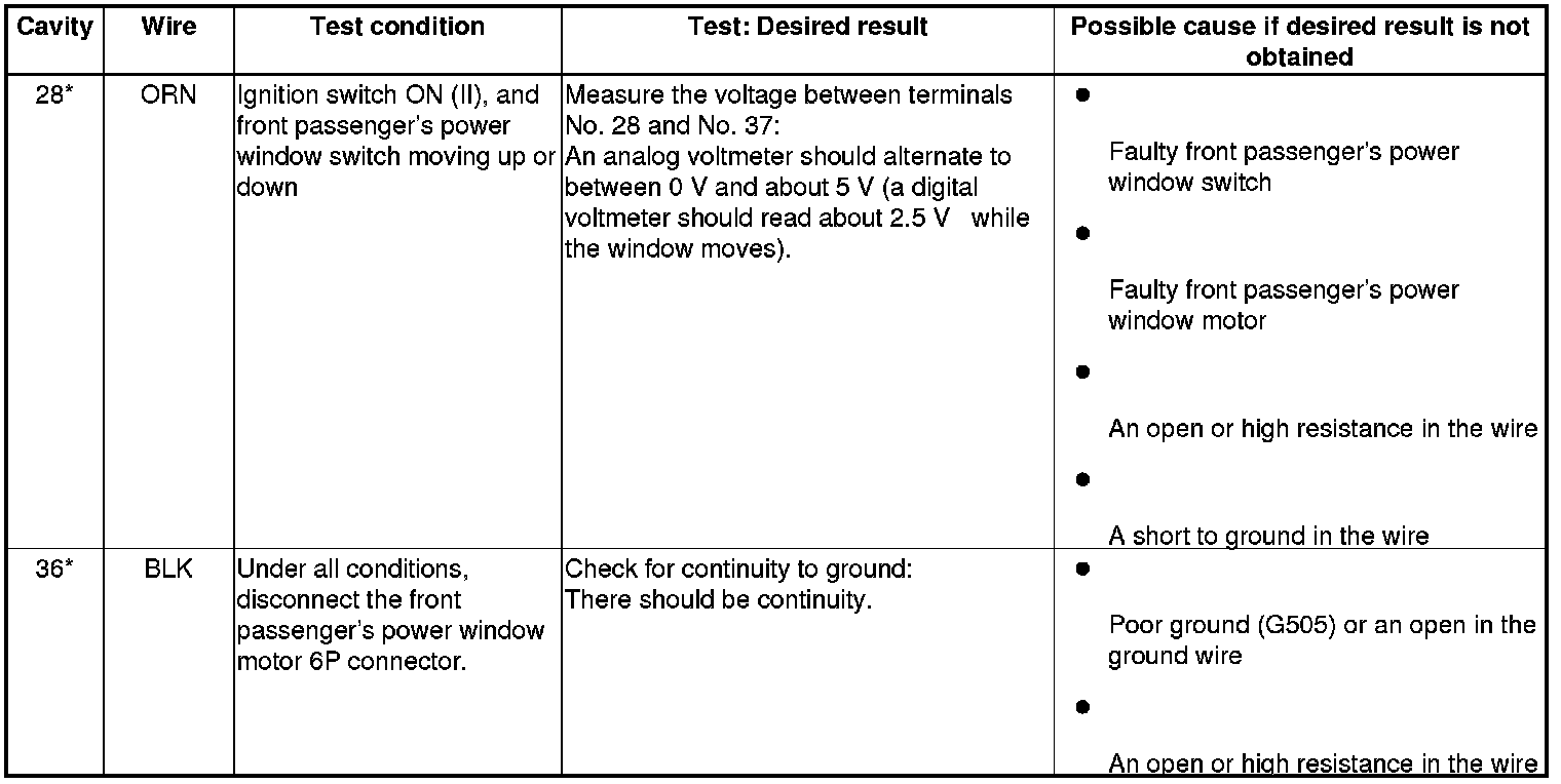 - If all the input tests prove OK, replace the front passenger's power window switch, then go to step 9.
