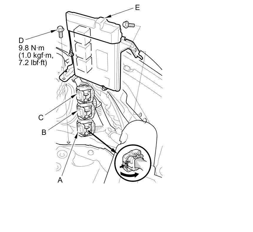 11. Disconnect ECM/PCM connectors A, B, and C, then remove the ECM/PCM assembly (E).