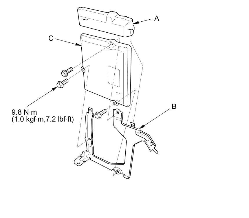 12. Remove the cover (A) and the bracket (B) from the ECM/PCM (C).