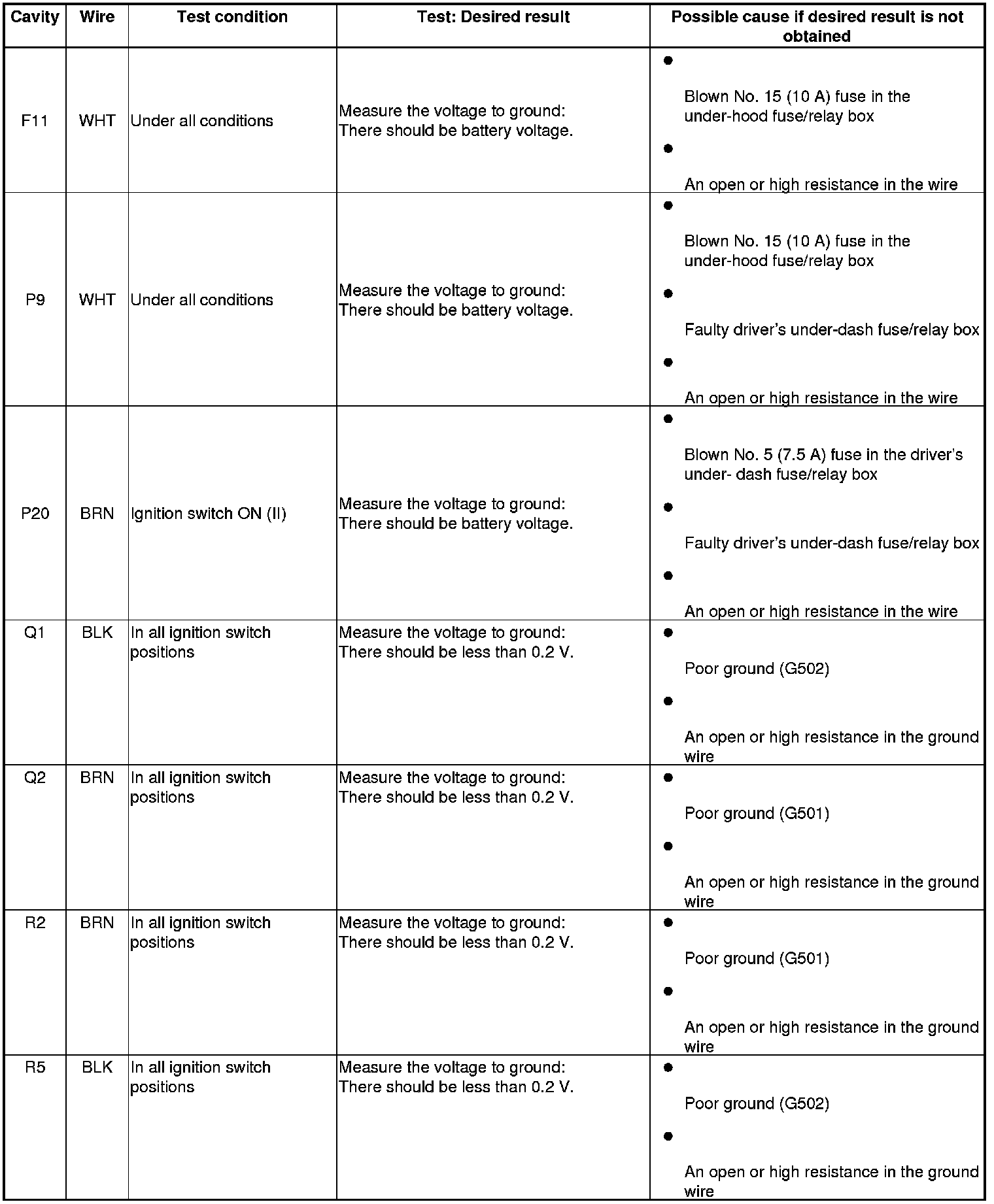 7. Turn the ignition switch to ON (II), and do the following input tests: