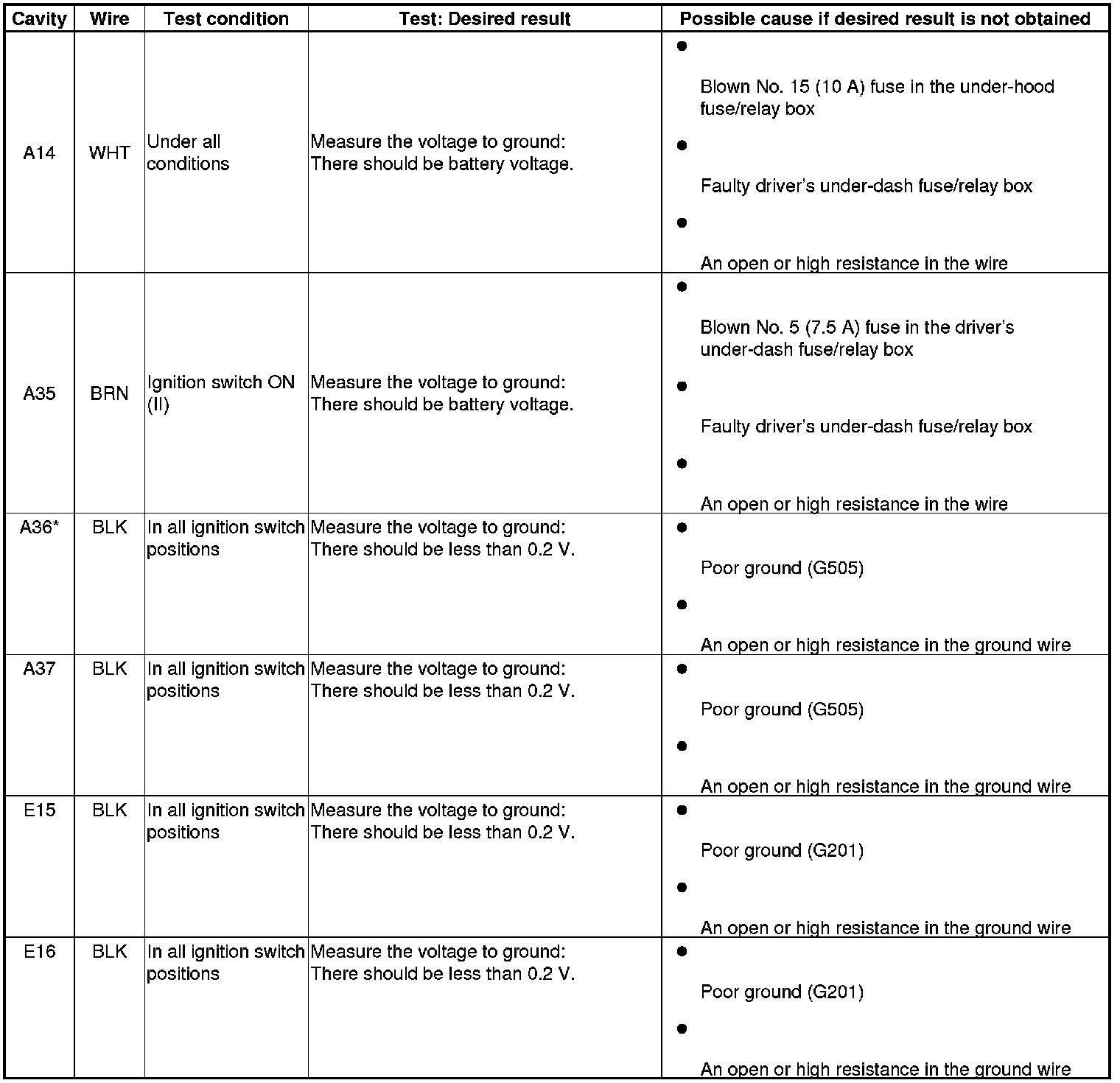 13. Turn the ignition switch to ON (II), and do the following input tests: