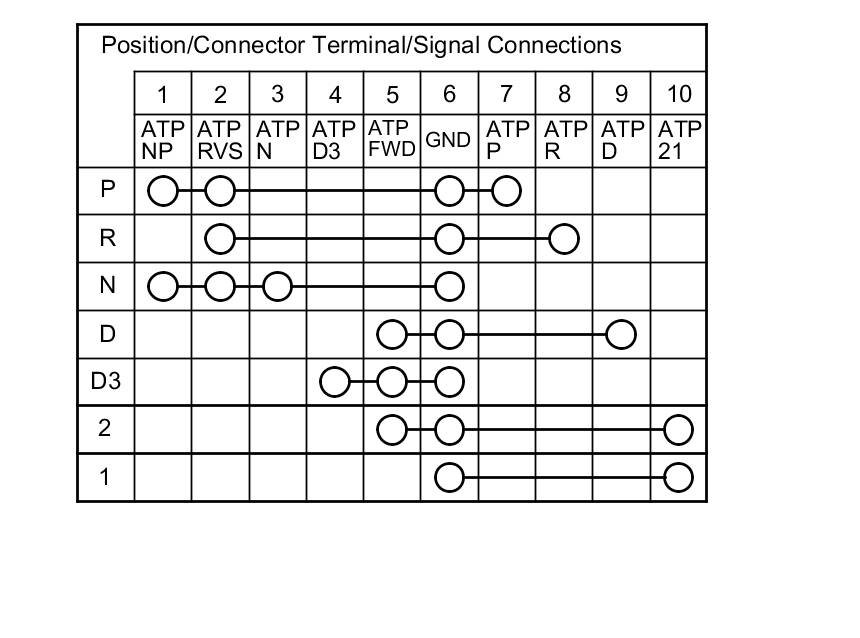 5. Check for continuity between terminals at the transmission range switch connector. There should be continuity between the terminals in the following table for each switch position.