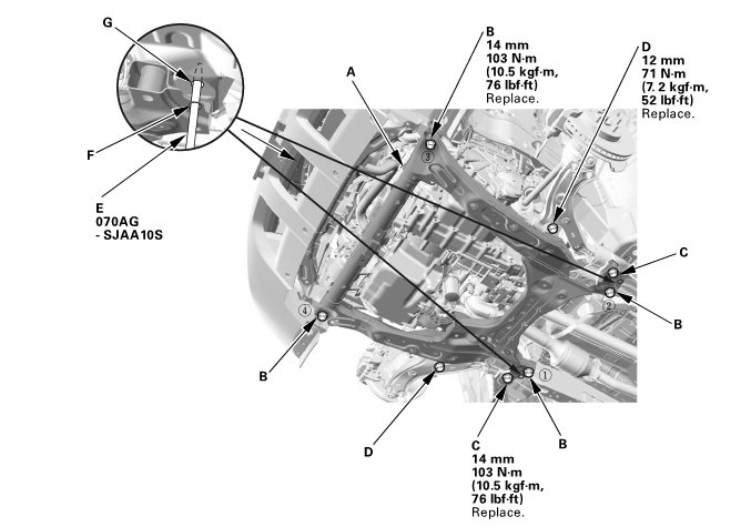 NOTE: After removing the subframe mounting bolts, be sure to replace them with new ones.