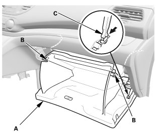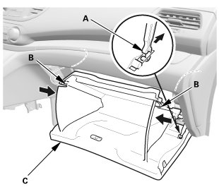 1. Detach the glove box damper hook (A), and release both glove box stops (B) by pushing them in, then let glove box (C) hang down.