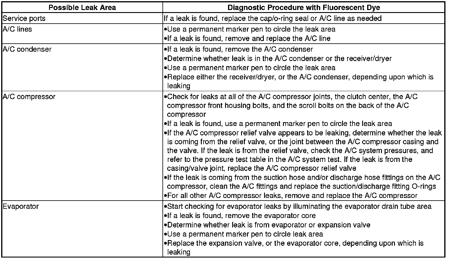 * PAG oil is water soluble, so condensation on the evaporator core or the refrigerant lines may wash the PAG oil and fluorescent dye away from the actual leak. Condensation may also carry dye through the HVAC module drain.