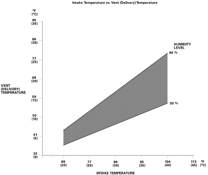 NOTE: The vent temperature and intake temperature should intersect in the shaded area. Any measurements outside the line may indicate the need for further inspection.