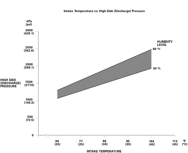 NOTE: The high side pressure and intake temperature should intersect in the shaded area. Any measurements outside the line may indicate the need for further inspection.