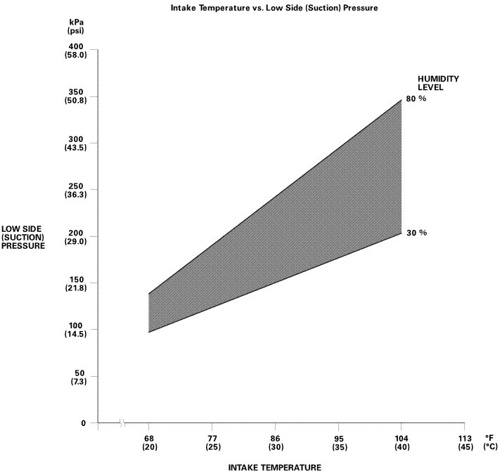 NOTE: The low side pressure and intake temperature should intersect in the shaded area. Any measurements outside the line may indicate the need for further inspection.