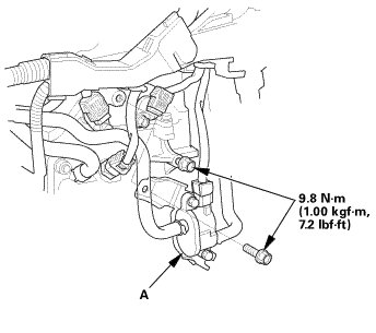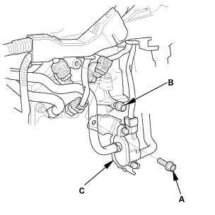 1. Remove the bolt (A) and loosen the bolt (B), then move the EVAP canister purge valve (C) with its bracket.