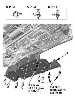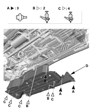 1. Remove the bolts (A) and clips (B, C), then remove the left middle floor undercover (D).