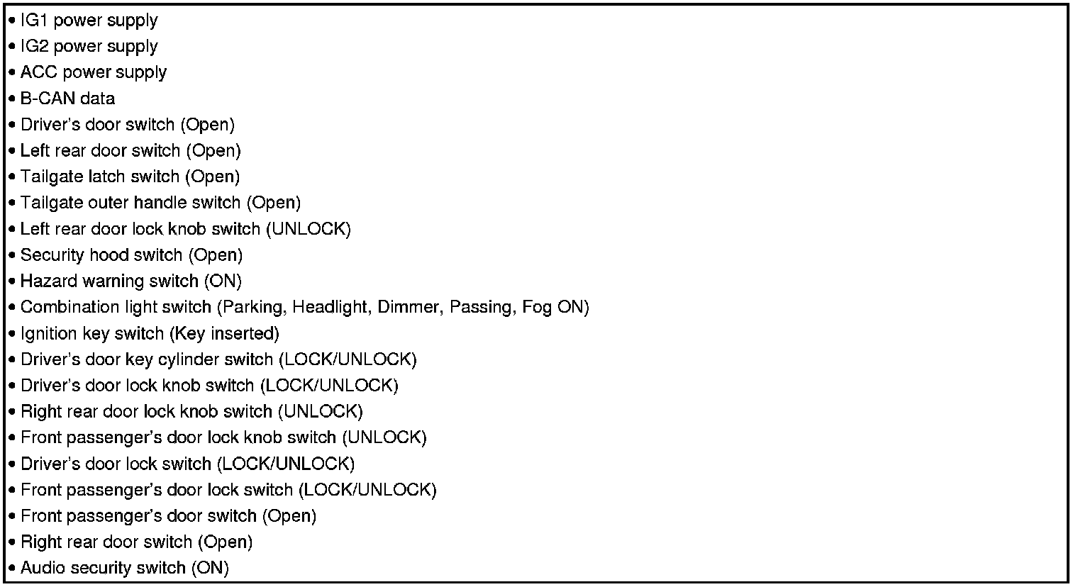 NOTE: If any control unit is faulty and does not wake up, several circuits in the system malfunction at the same time. Below is a list of the switches and input signals that wake them up.