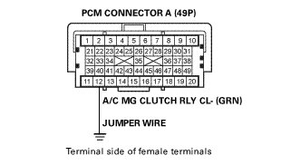 -NO- Check for poor connections or loose terminals at the A/C compressor clutch relay and the PCM. If the connections and terminals are OK, check the A/C compressor clutch relay. If needed, repair open in the A/C MG CLUTCH RLY CL- wire between the PCM (A12) and the A/C compressor clutch relay, or other parts in the A/C systems.