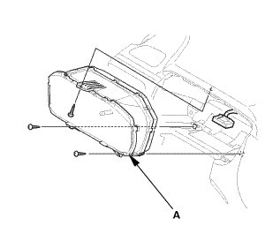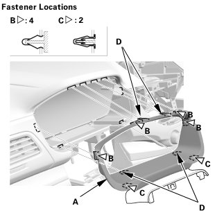 2. Pull out the dashboard meter visor assembly (A) with the appropriate trim tool to detach the clips (B, C) and the tabs (D), then remove the dashboard meter visor assembly.