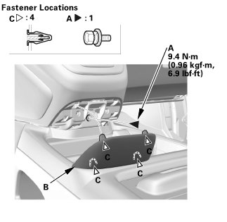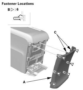 1. Carefully pry out the center console rear trim (A) with the appropriate trim tool to detach the clips (B) and the hooks (C), then remove the center console rear trim.
