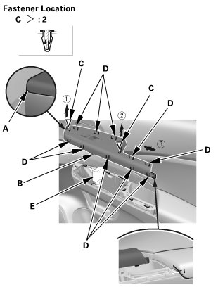 1. Carefully pry out on the notch (A) in the power window switch panel (B) with the appropriate trim tool to detach the clips (C) and the hooks (D). Disconnect the connector (E), then remove the power window switch panel.
