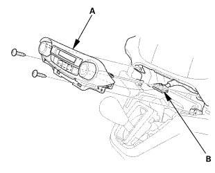 1. Remove the climate control unit assembly (A), then disconnect the connector (B).
