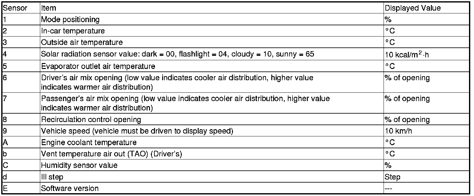 The climate control unit has a mode that displays the sensor inputs it receives. This mode shows you what the climate control unit is receiving from each of the sensors, one at a time, and it can help you determine if a sensor is faulty.