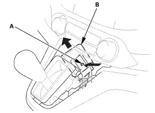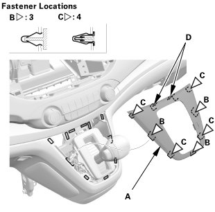 1. Carefully pry out the shift lever panel (A) with the appropriate trim tool to detach the clips (B, C) and the hooks (D), then remove the shift lever panel.