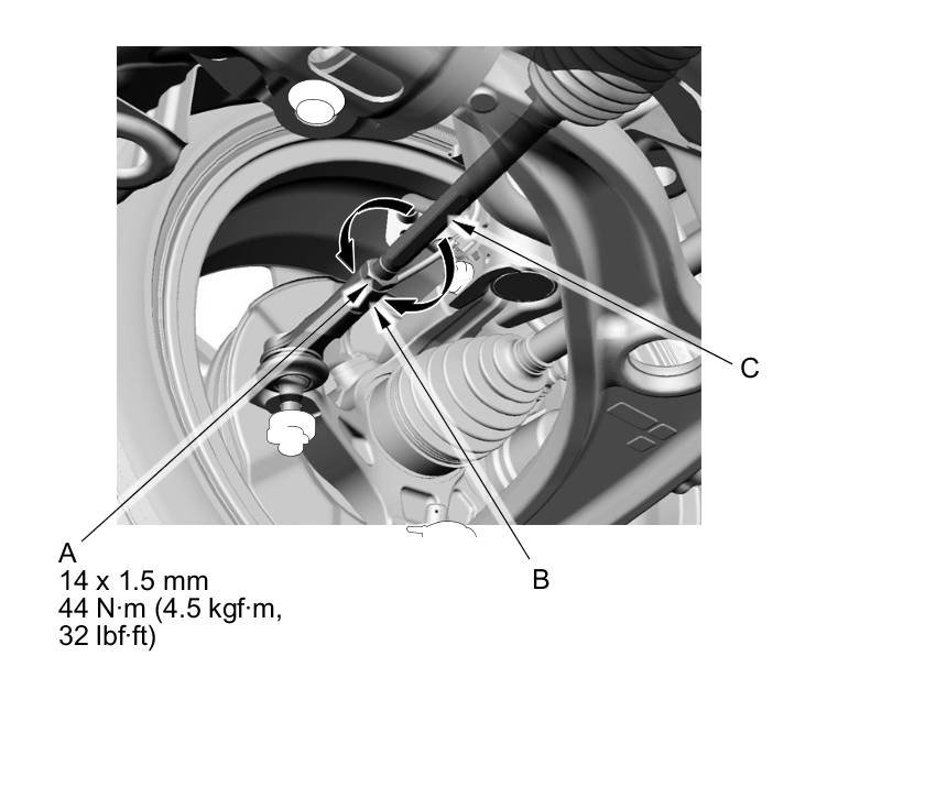 3. Loosen the tie-rod end locknuts (A) while holding the flat surface sections (B) of the tie-rod end with a wrench, and turn both tie-rods (C) until the front toe is within specifications.