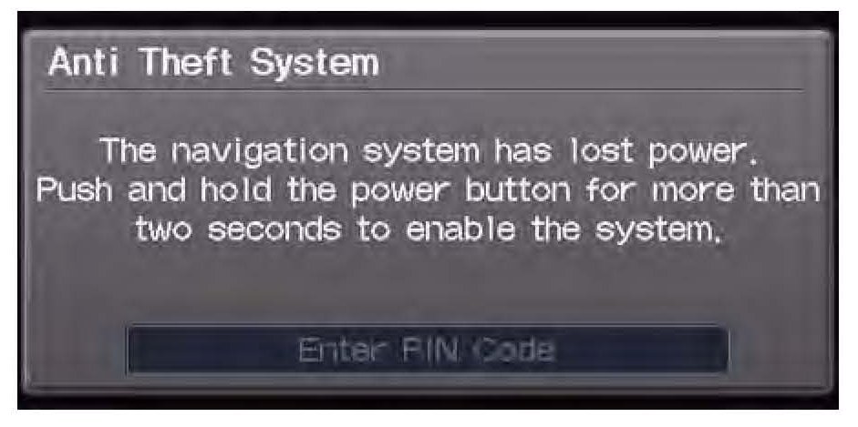 *3. Start the engine, and drive the vehicle outside away from buildings, tall trees, and power lines. If needed, press audio unit power button to turn on the audio navigation unit. When ENTER PIN CODE appears on the audio unit display, press and hold the audio unit power button for about 2 seconds to allow the PCM to verify that the vehicle's VIN and the VIN saved in the audio unit match. You'll hear a long beep when the audio unit exits the anti-theft mode. Release the power button.*