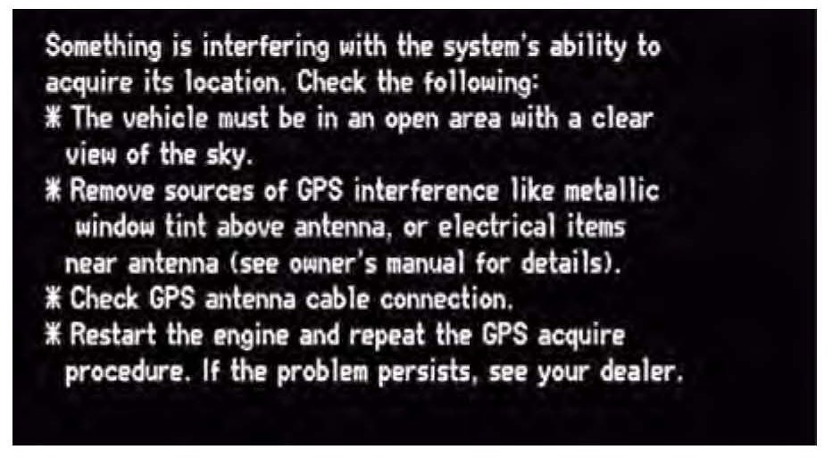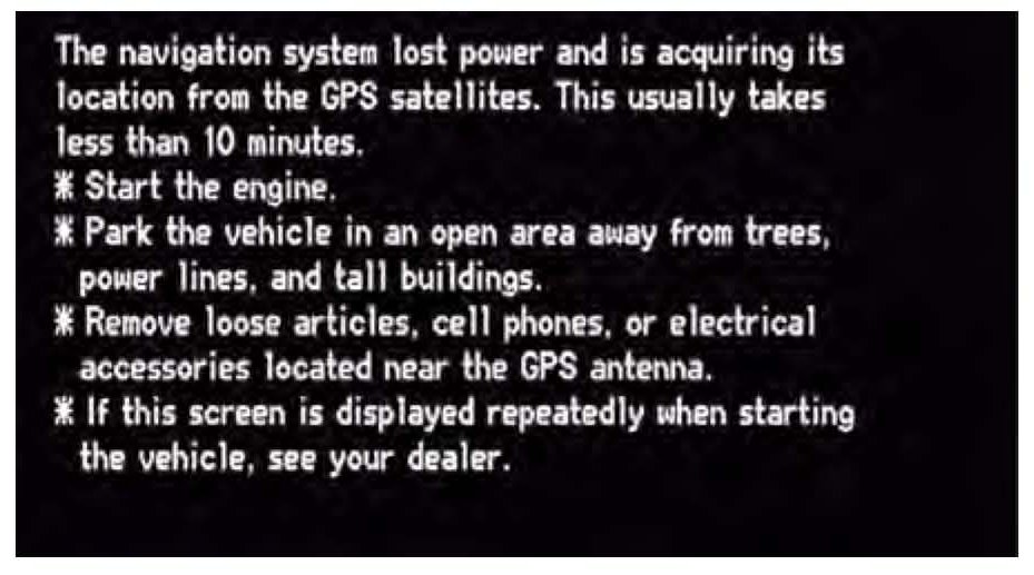6. If the system does not initialize within 10 minutes, the screen (shown) appears. The system is still initializing but does not automatically exit to the screen above when initialization is complete. Do not immediately follow the instructions on the screen. After 30 minutes, try restarting the vehicle to see if the navigation system completed the initialization. If not, follow the instructions on the screen.
