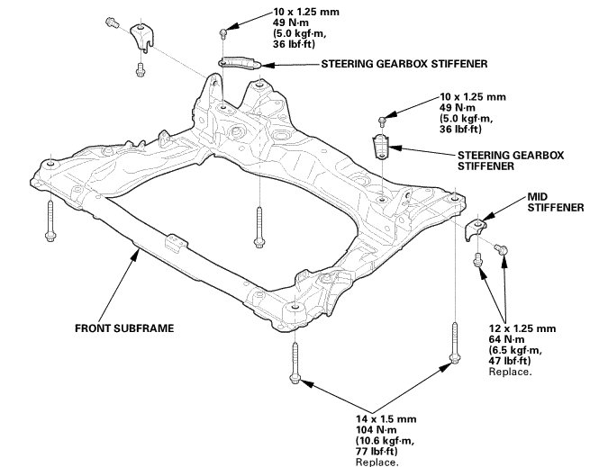 NOTE: After removing the subframe mounting bolts and the mid stiffener mounting bolts, be sure to replace them with new ones.